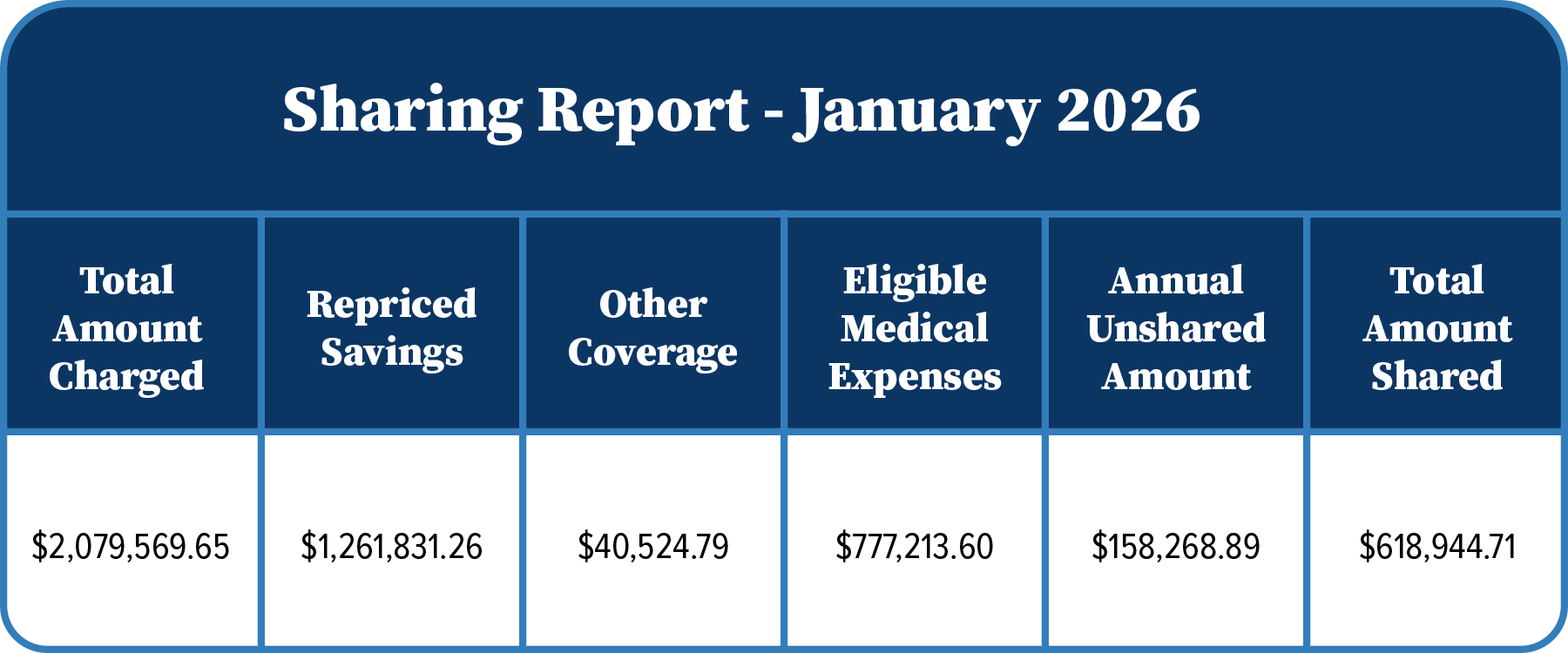 Below is Solidarity HealthShare’s sharing report for the month of January 2026. From January 1 through January 31, 2026 inclusive, Solidarity HealthShare received $2,079,569.65 in eligible medical needs on behalf of our Members, which was re-priced and shared at $777,213.60.